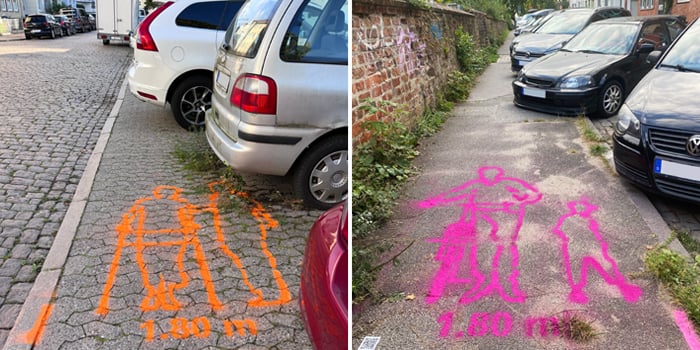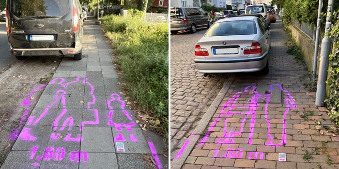 (z.B. zwei nebeneinander gehende Personen). An vielen Stellen parken jedoch Autos auf den Gehwegen, teils behördlich erlaubt, teils nicht. Die Kreidefiguren weisen auf den Missstand hin, dass die